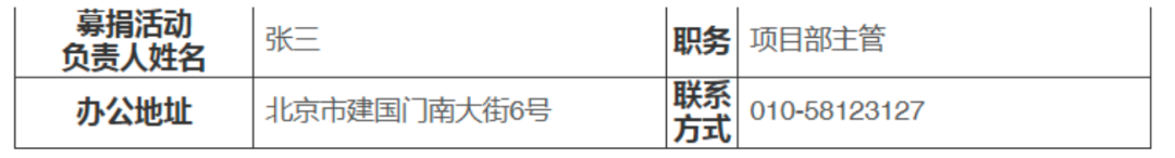(九)募捐活动负责人姓名、职务、办公地址、联系方式。应当填写慈善组织负责该募捐活动的专职负责人员姓名和职务,仅填写一人的信息;地址为慈善组织办公地址,不得填写合作方或者执行方地址,填写联系方式时注意保护个人隐私,建议填写办公室座机号。