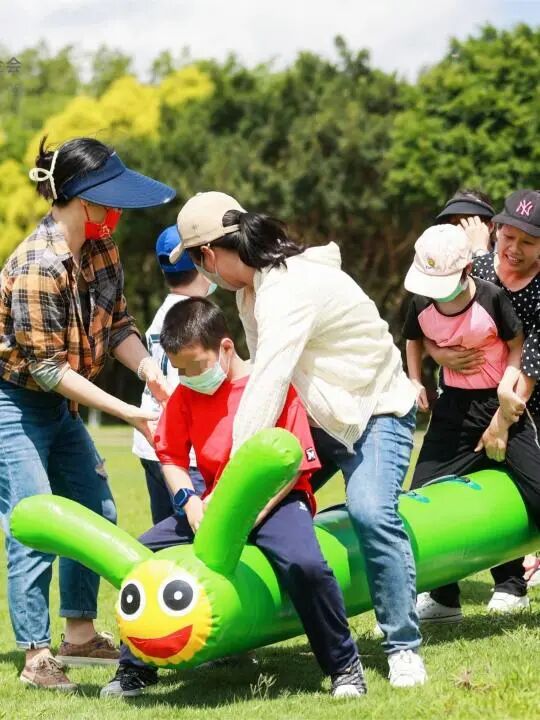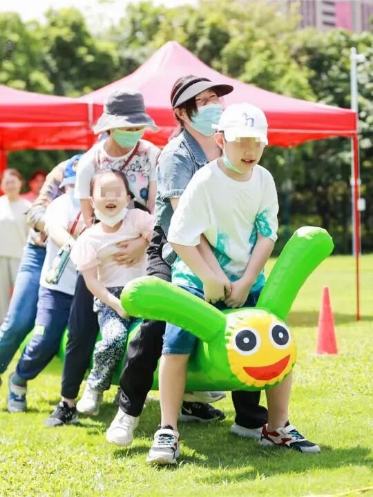现场的自闭症家庭组队共同体验了快乐毛毛虫、履带战车、快乐飞盘、两人三足等游戏,欢乐的气氛环绕在现场的每一处角落。